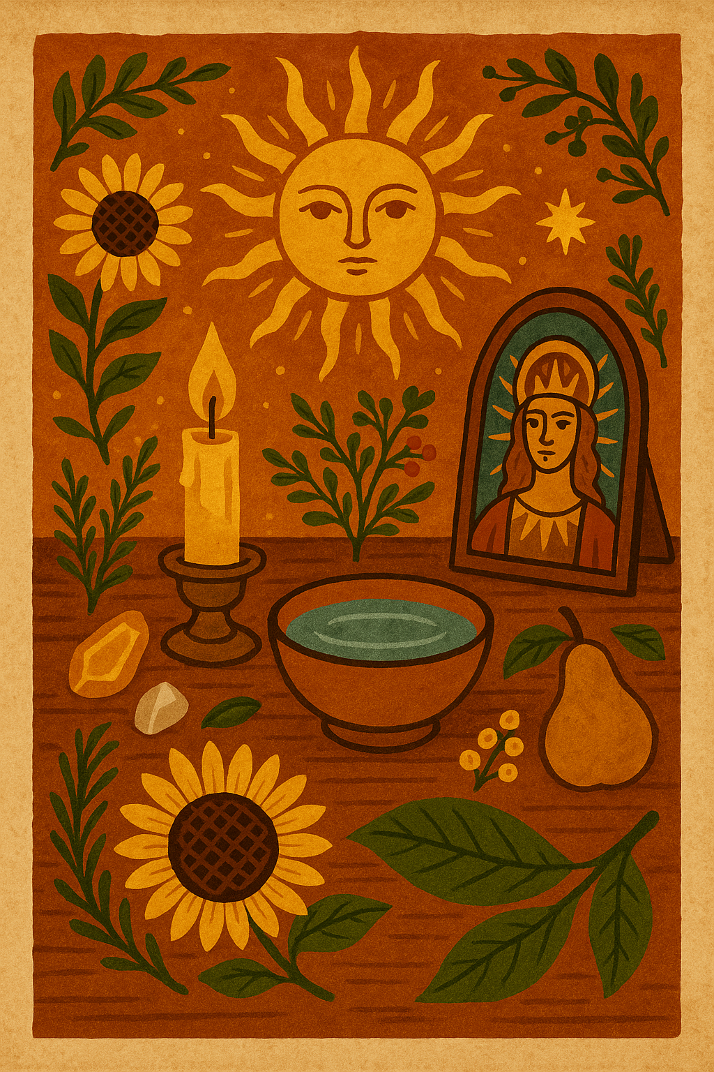 Any altar decorations you like — sunflowers, herbs, crystals, seasonal fruit or a solar deity image